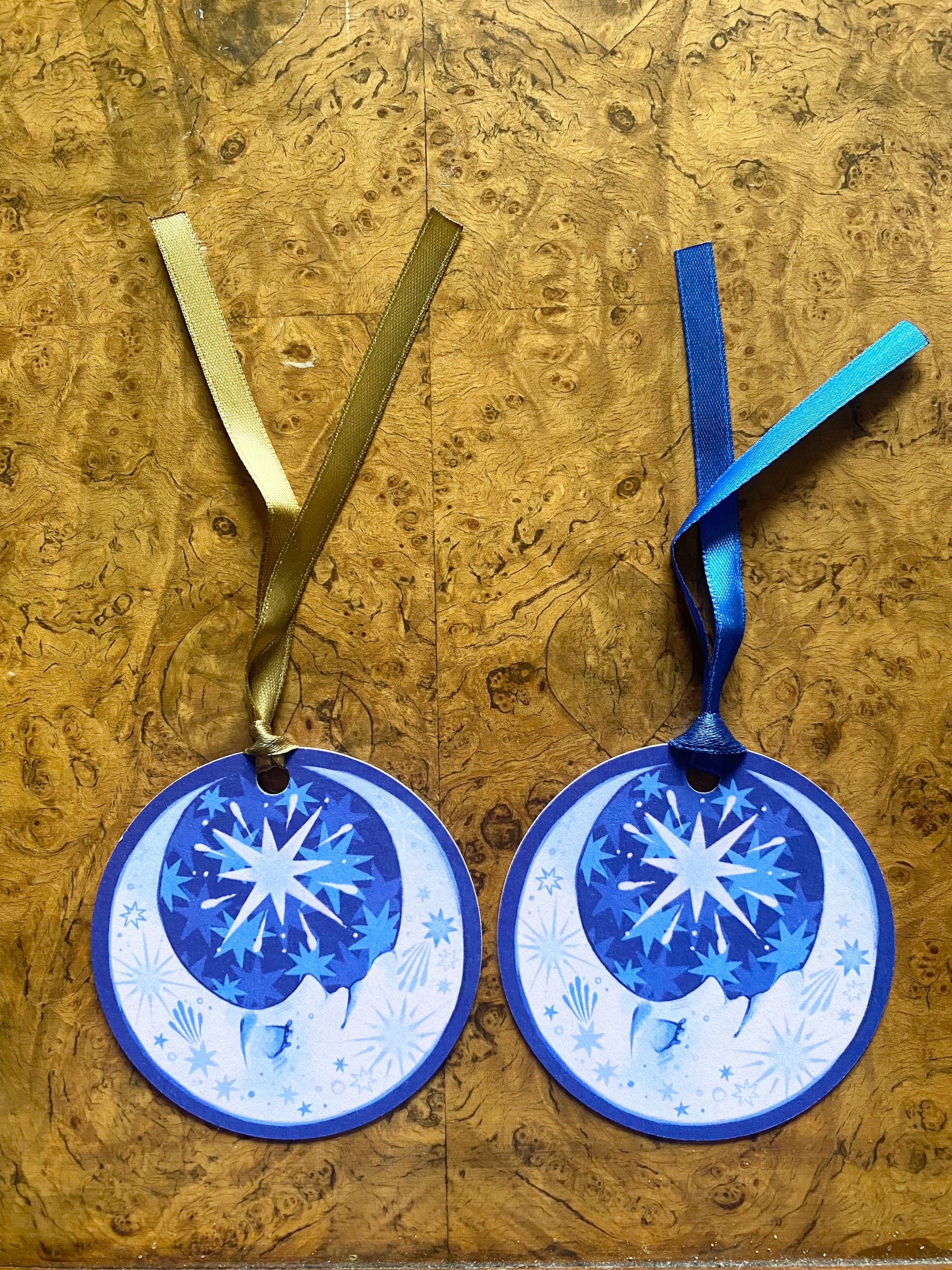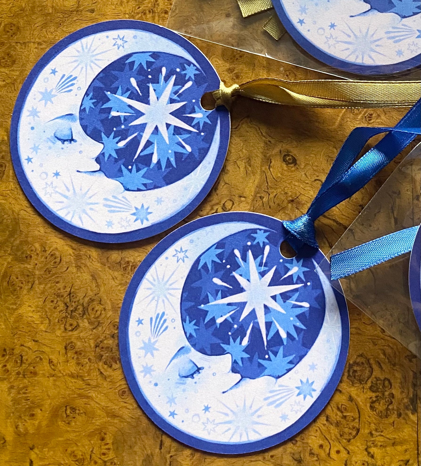 Luxury gift tags with a crescent moon design. Handmade and illustrated, finished with a blue or gold ribbon.