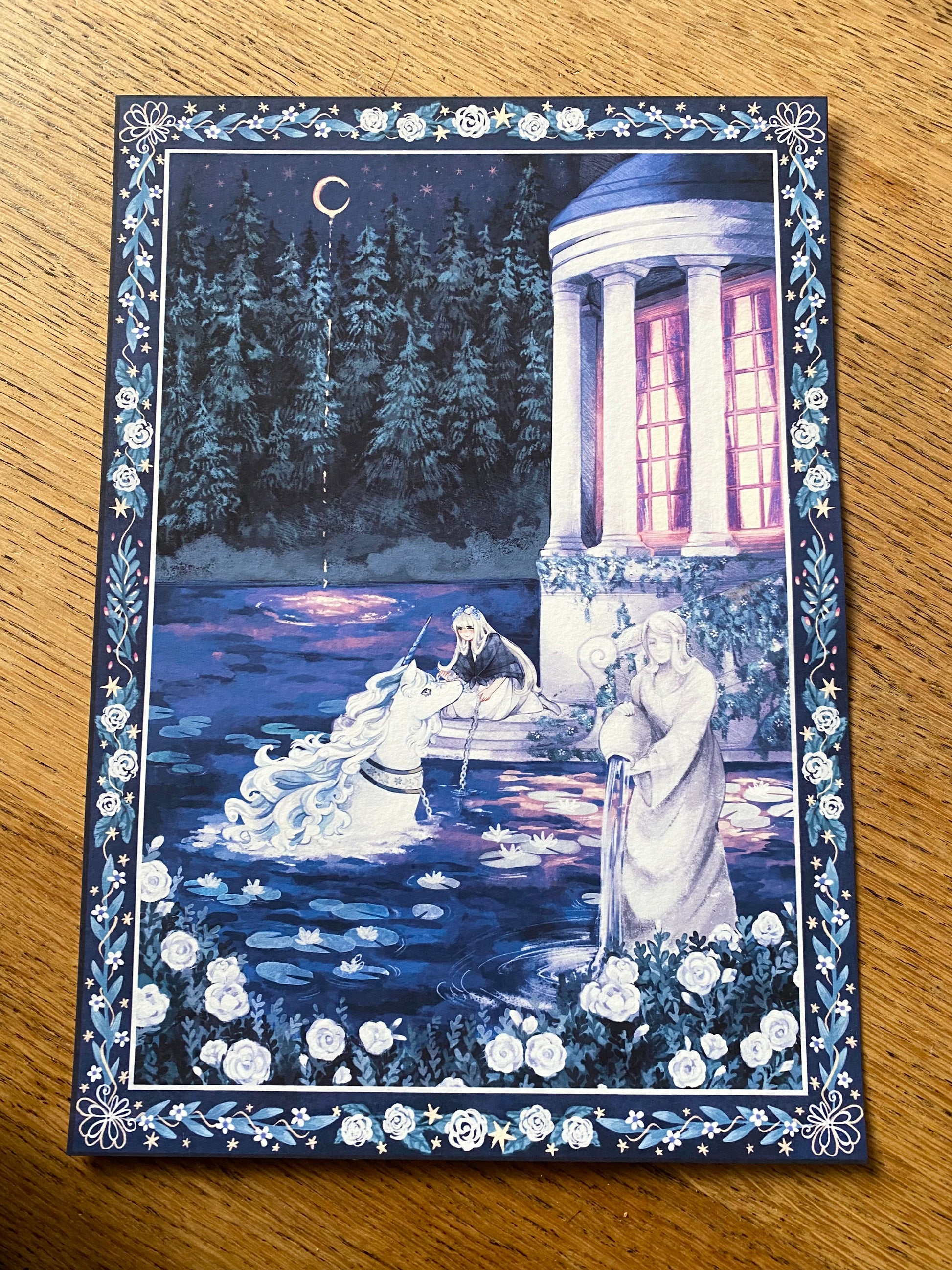A young woman releasing a unicorn from captivity into the garden lake on a crescent moon winter night.
